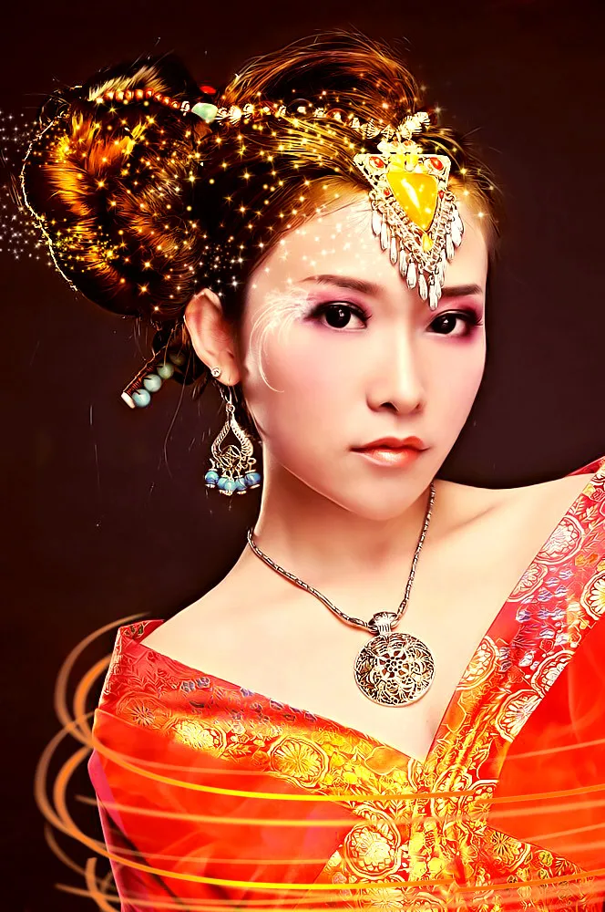 美化人物脸部 把脸型修小一点 选一个另类的效果巴 色调要艳丽一些 千万别加文字字母花花草草之类的 基调:典雅唯美 艺术化:深度艺术化