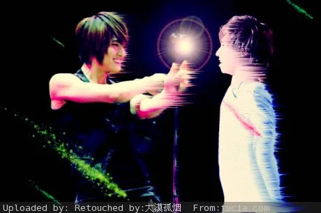 请把这张图和参考图片融合在一起处理成一张可以当电脑桌面的图图~~~ 两个人的比例大小最好调成一样的~~ 如果能融合在一张很清爽的背景里最好~ (请将花瑜那个LOGO去掉) 谢谢啦^-^ 用途:娱乐 基调:欢悦明快的 背景:朦胧化