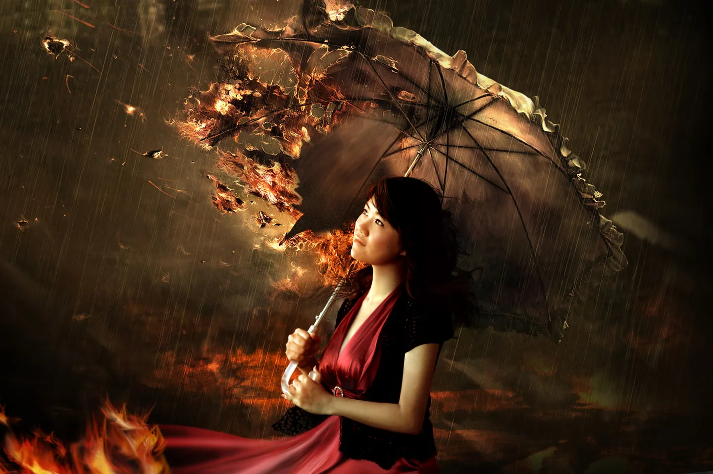 伞是合成的啦。把原人物去了,再把伞收拾一下,火的面积改小点,画下裙子,脸上加上红光,弄些头发。OK!哈哈~~