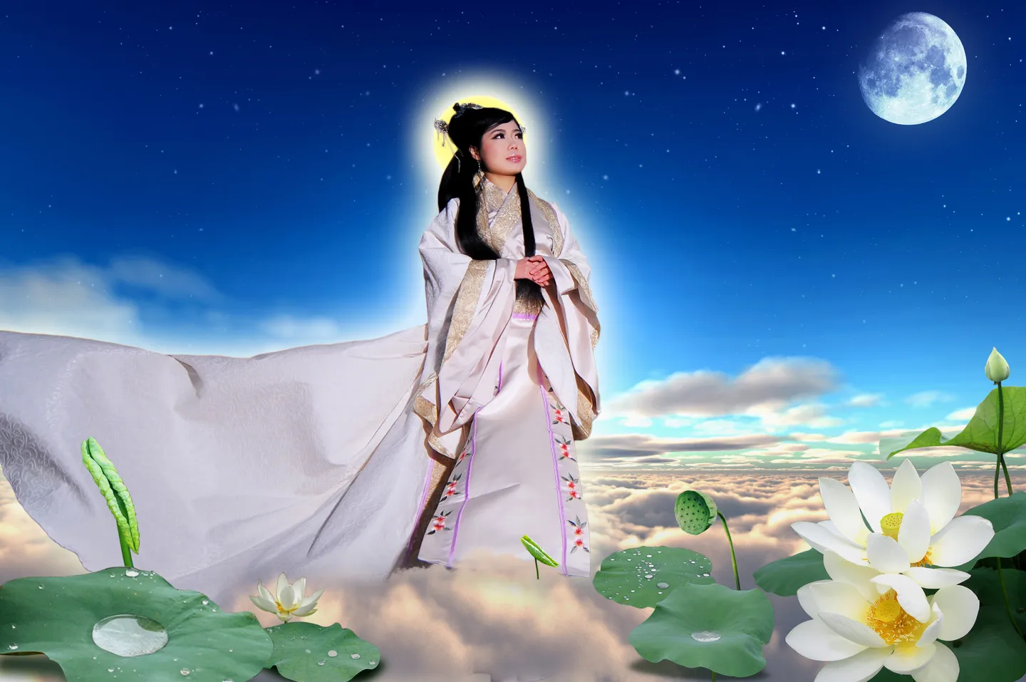 这个不错,好看,就是你是要变观音吗?头部后面的光圈小了点,可以大点且淡点,哈哈……不过这个肯定是天上的瑶池边……嘿嘿