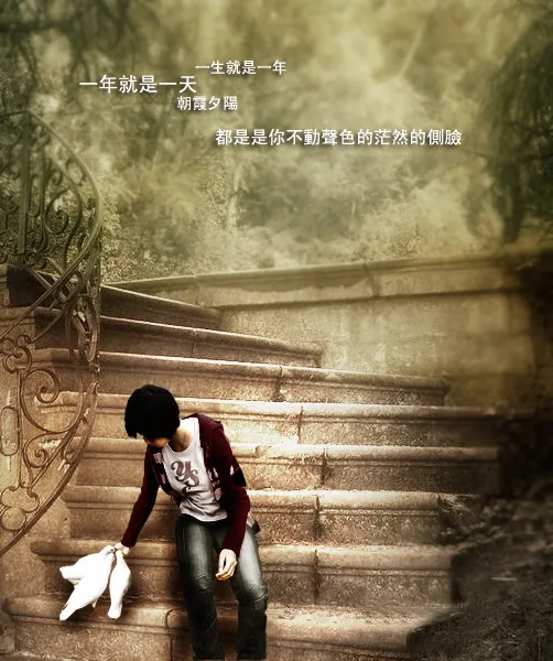 哪位大师有灵感就帮我做吧,右边那个人要去掉,请细心P,我会一直等着的。 呃..帮我加句话在旁边 谢谢了 “一生就是一年 一年就是一天 朝霞夕陽 都是是你不動聲色的茫然的側臉”