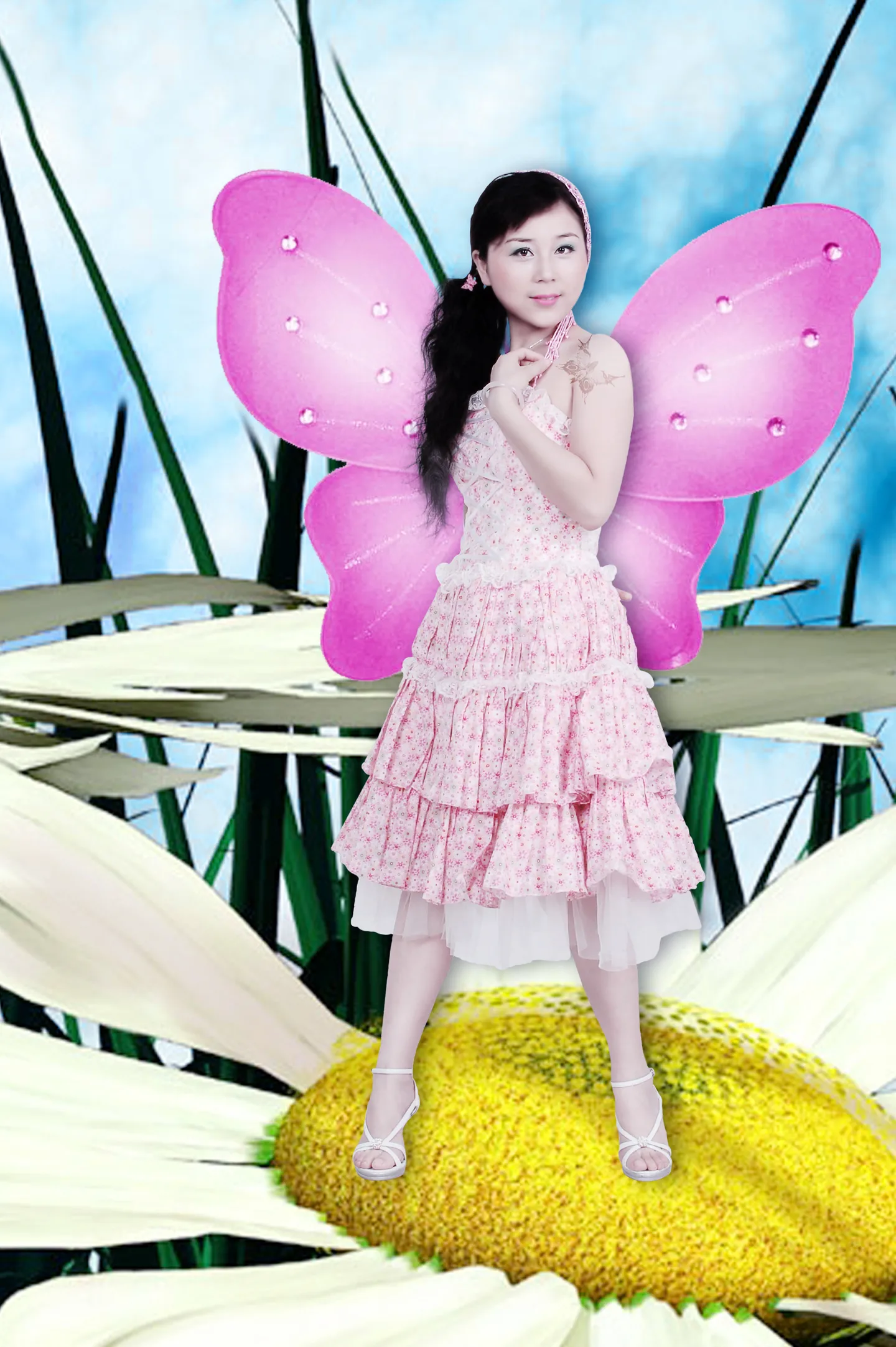 肤色提亮, 右下角的布景布去掉. 艺术化:轻微艺术化 基调:欢悦明快的 背景:稍作调整