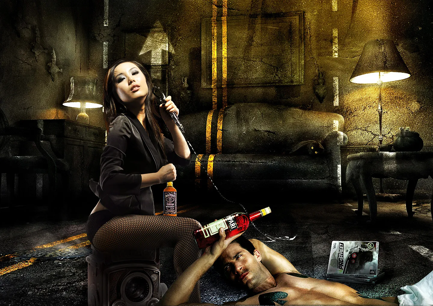 我真是服了你了,他的那张作品背景用的站酷网上的一个壁纸,我也有那个素材,我把那个男人丛背景上扣了出来,合成在这个背景上,女人手上的东西也是我找的素材合成进去的,汗,这也要说,我真汗。。。。。