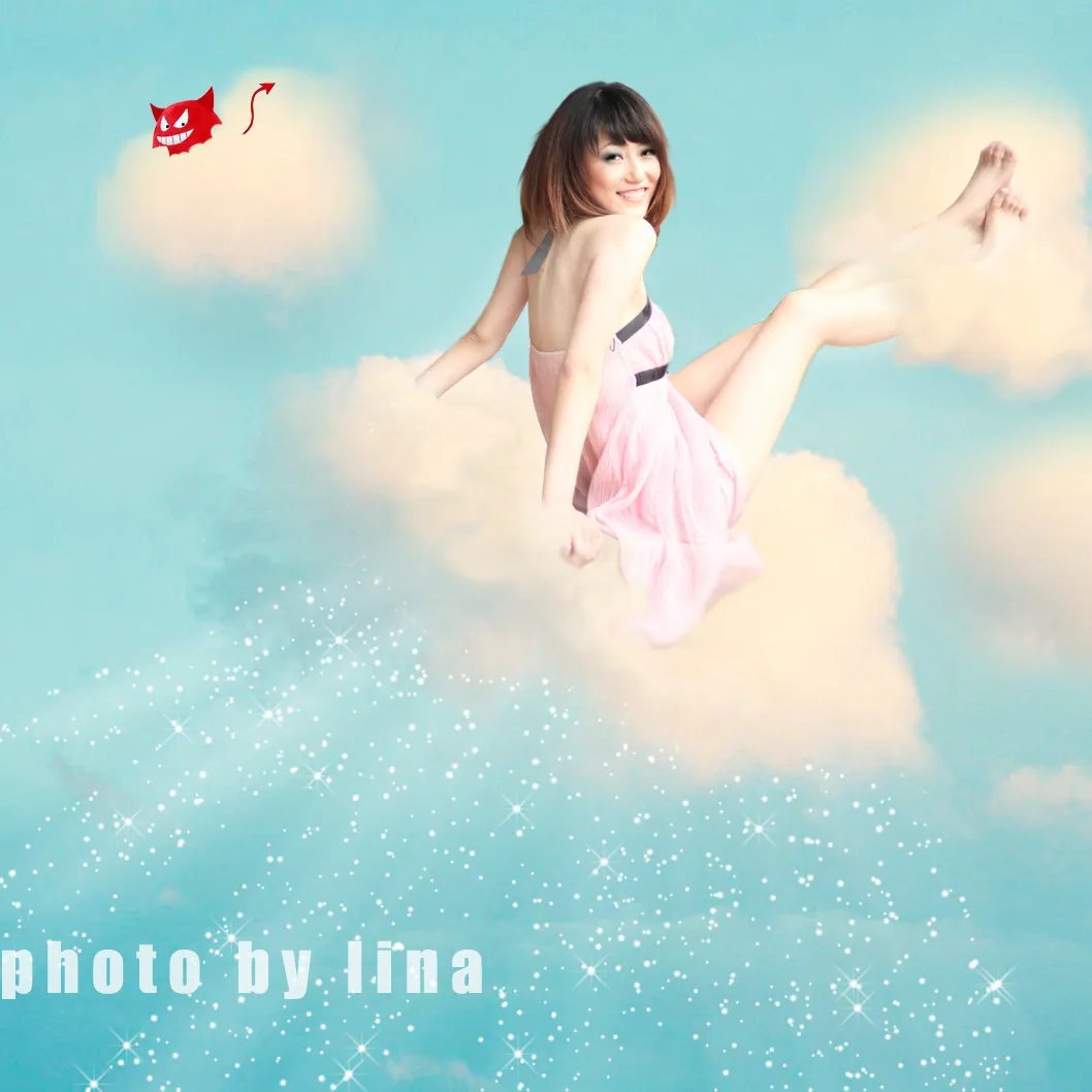 美女飞上云朵。那只小怪怪很好玩哦