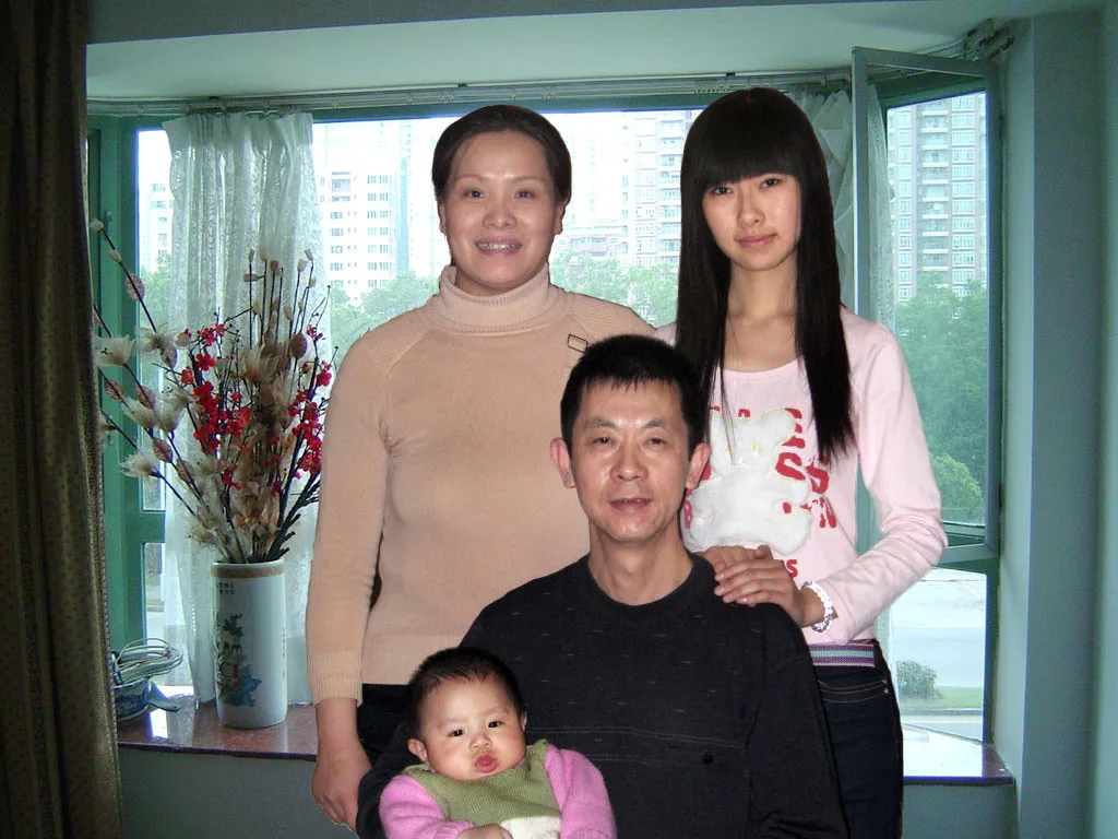 这是一幅全家福,麻烦帮我做一下,谢谢,稍微亮点,长发的这个女的脸上的痘给去一下,背景换个温馨点的!