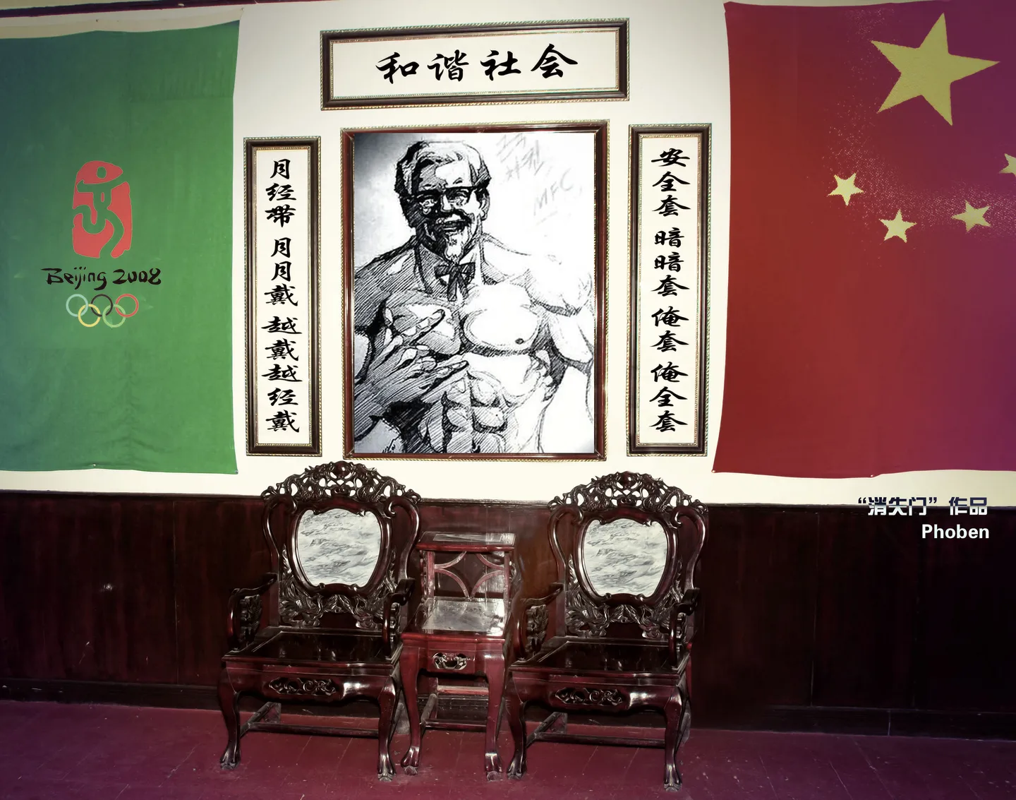 呵呵 照片上是小鱼肉的大学同学 我的意见么是把墙上的国父的照片做成椅子上的那个人的画像。。。要不也没什么可发挥的了吧。。。 各自发挥吧~ 小鱼肉先谢谢了~