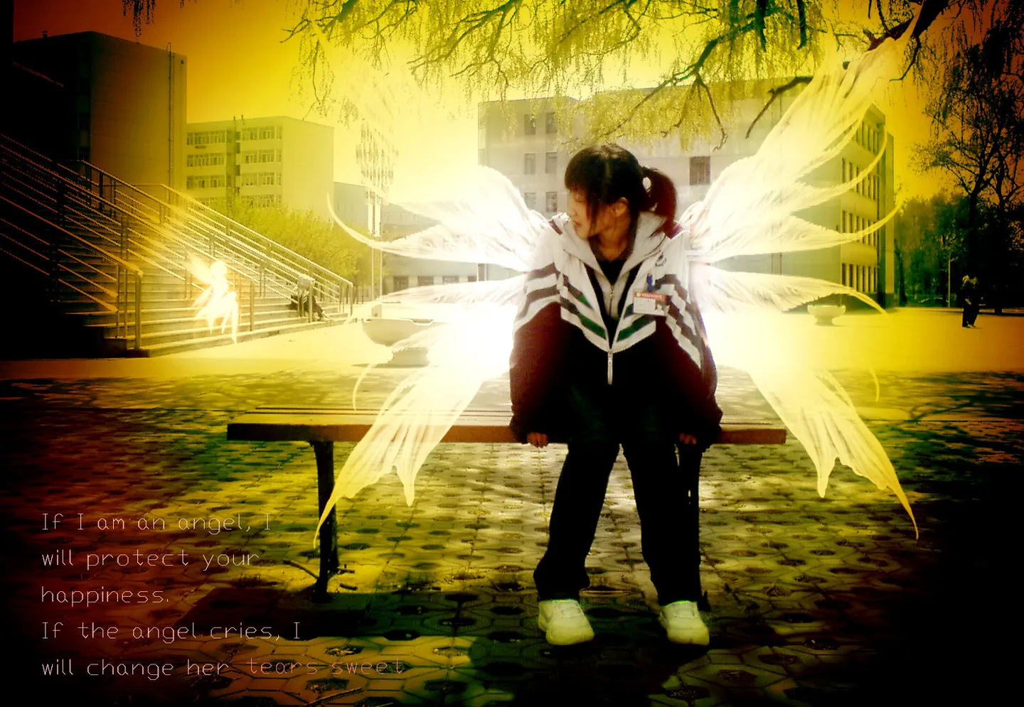 本来想弄个颓废点的,但这张照片的姿势实在是非常好,帮你弄了个稍微梦幻点的,左下角英文的意思是“若我是天使,我会守护你小小幸福;若天使掉眼泪,我会把天使的眼泪化作甘露!”