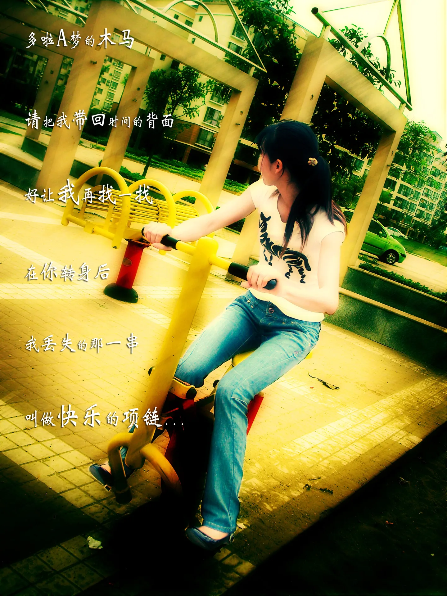 又來麻煩你了 麻煩你把日期去掉 突出牛仔褲 最好要搞個意境出來 還要配段文字: 多啦A梦的木马, 请把我带回时间的背面, 好让我再找一找, 在你转身后, 我丢失的那一串, 叫做快乐的项链。
