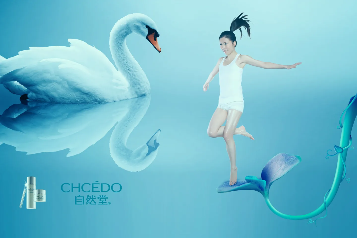 脚踩叶子很漂亮……天鹅也很应景……就是旁边化妆品“自然堂”可以不用,呵呵。这样的话就是给自然堂做广告了,哈哈