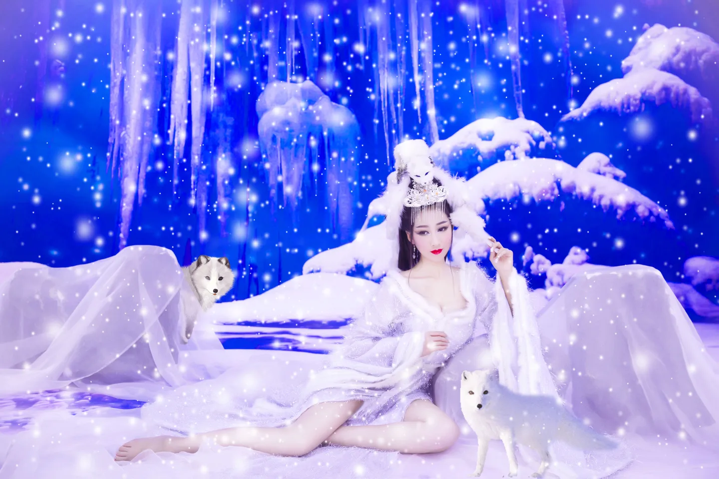 加的两只小狐狸好可爱呀,前面那只白白的毛茸茸的颜值好高,后面那只贼头贼脑的好俏皮,而且还加了飞雪,跟背景更搭了,色调也好看,谢谢越梦大神