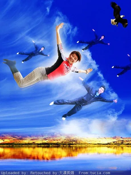 女超人飞翔图是以前给别人做的.自己非常喜欢,现在自己的桌面就是这张..放大看极爽.可惜小图看不出来效果..这次把帅哥和美女一起放上天空...飞翔吧阿门...
