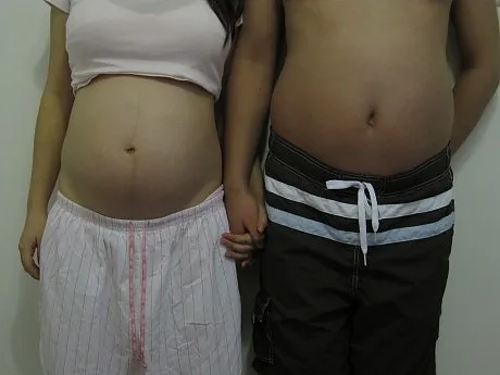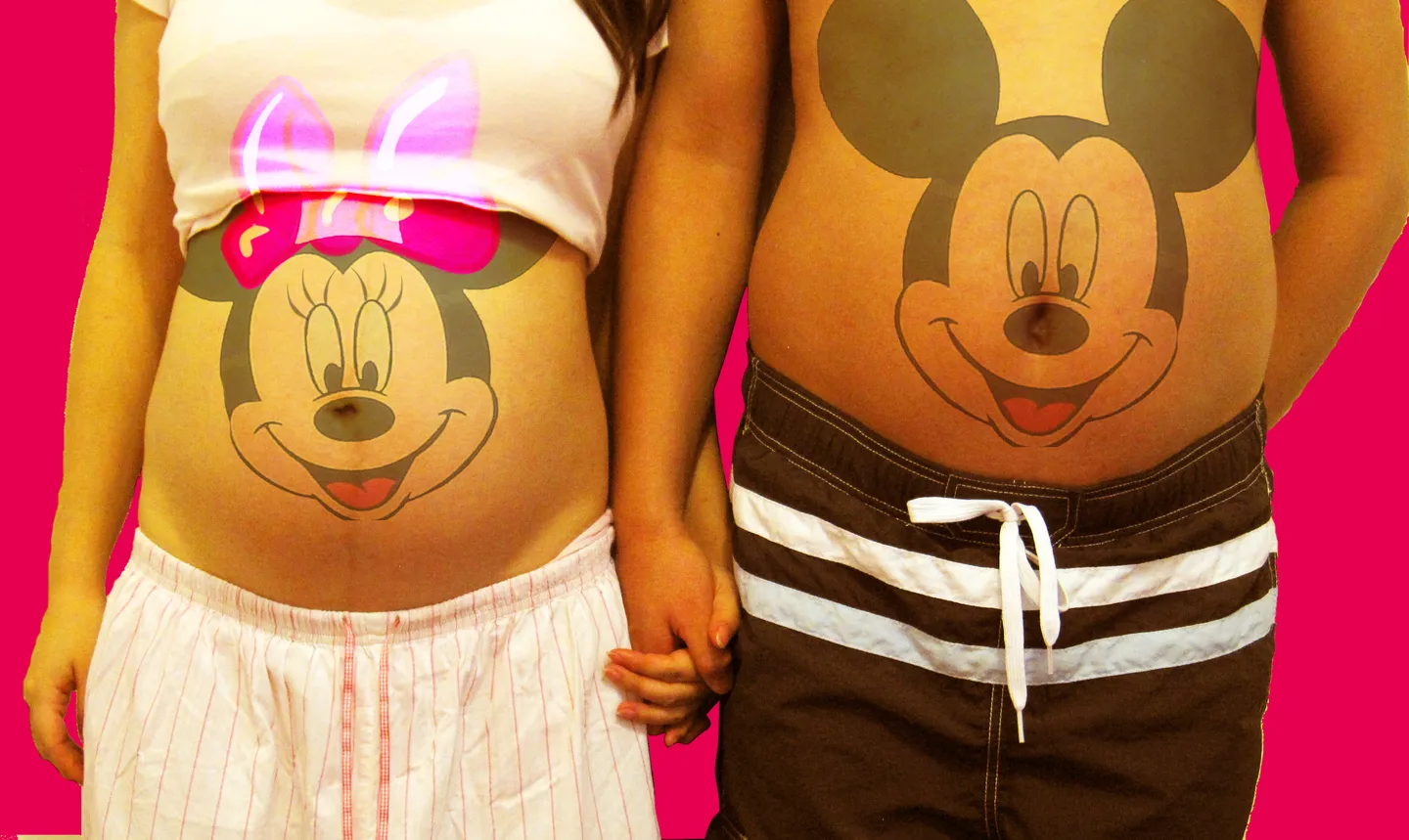 可以缩小一些 换一个好看的背景 要可爱风格的 女的肚皮上的那条纹修掉 不要失真 加一些可爱的元素 有创意的