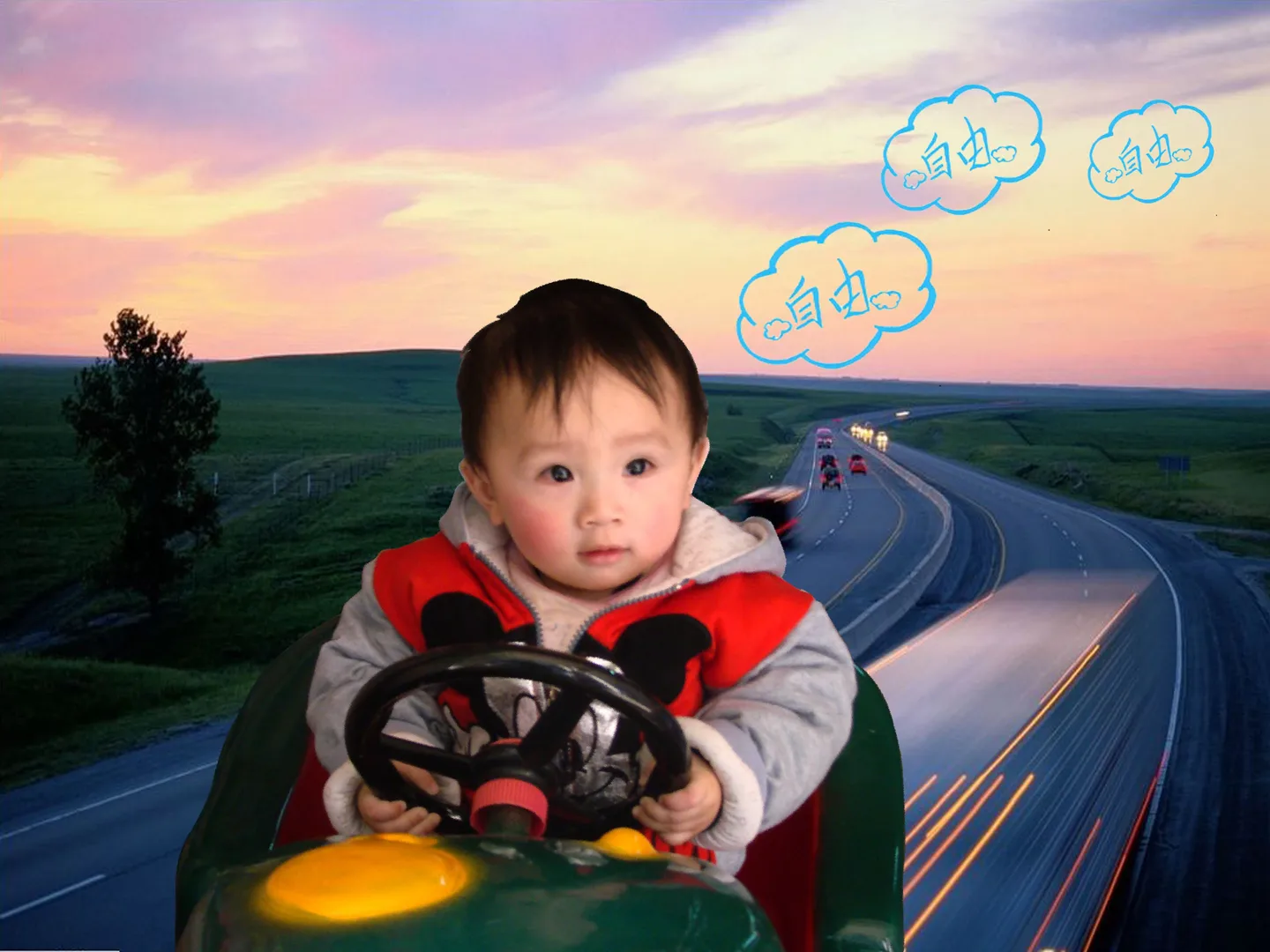 请将BB和车后面背景换掉,能否改成开车在公路的感觉,BB的眼睛红眼能否消去,谢谢