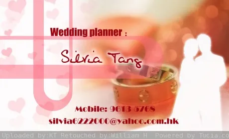 您好,我想把這張圖片做成名片,背景要換成粉紅色的,(希望可以多幾種款讓我選擇)主要是要突出戒指.還需要添加上名片內容,如下:(痲煩了,謝謝!) Silvia Tang Wedding planner Mobile: 9613 5768 silvia6222000@yahoo.com.hk
