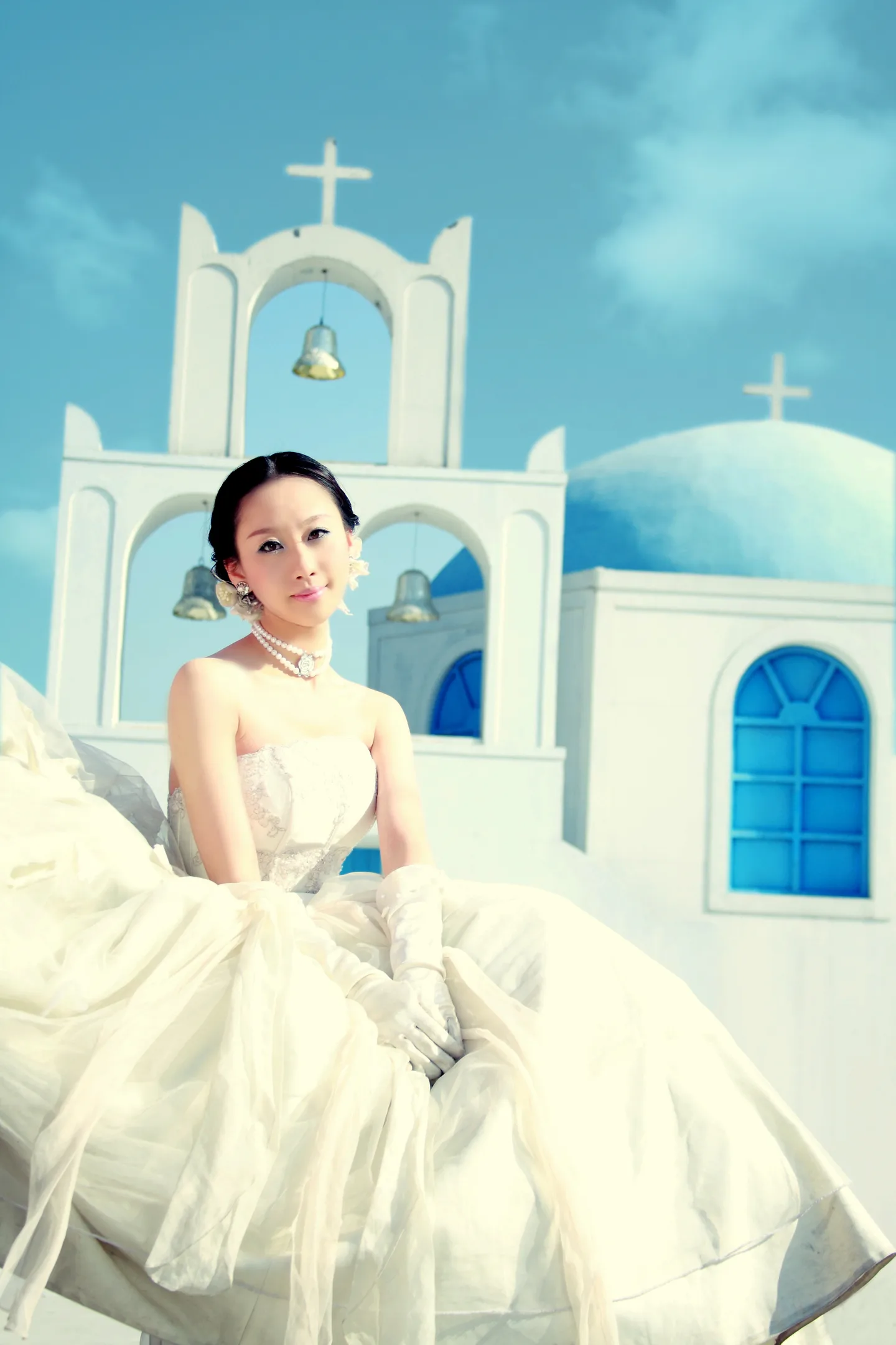 因为坐在楼梯上,所以有点斜了。