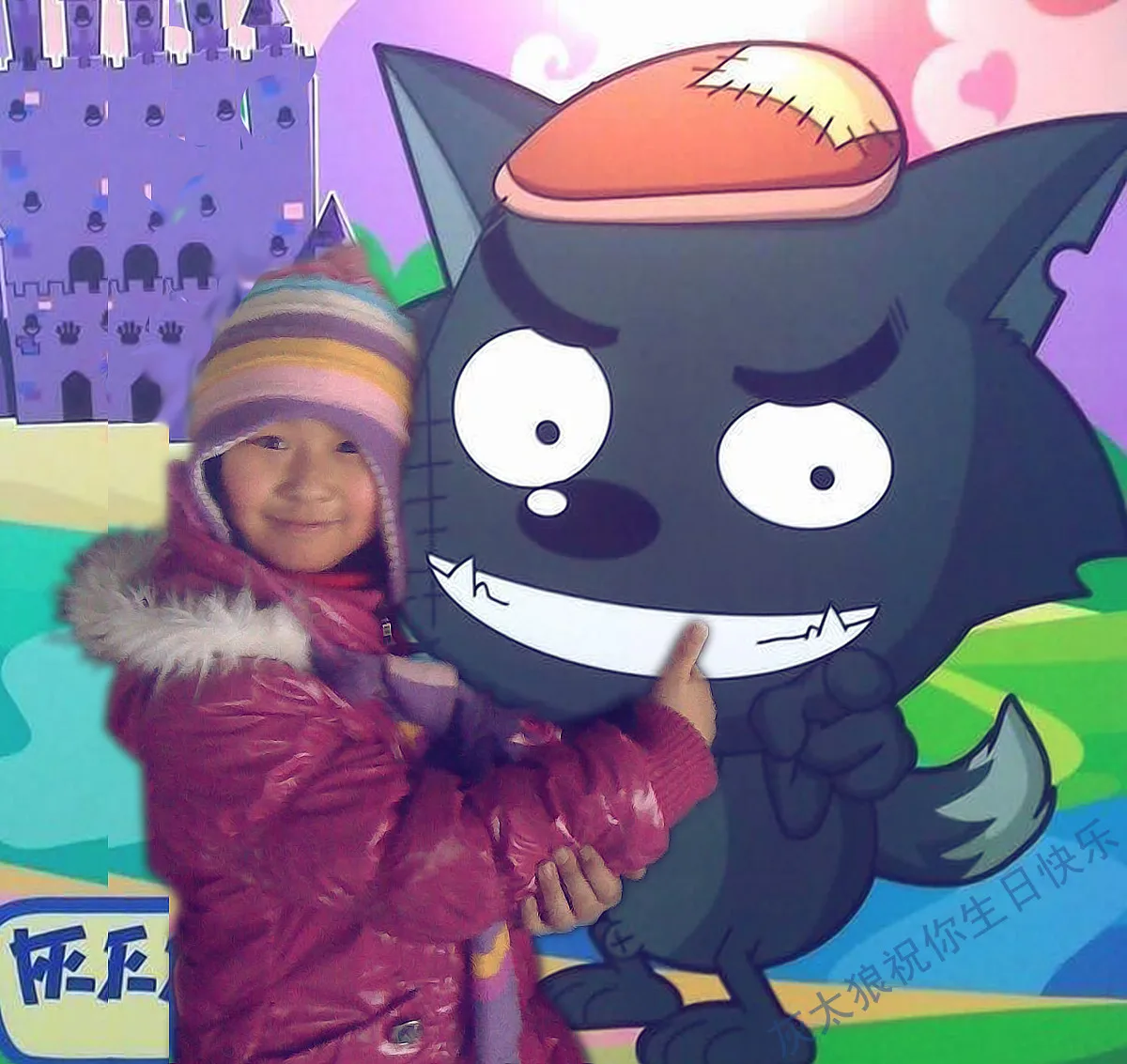 帮我把女孩子后边的胖子小孩改成灰太狼,谢谢了。给孩子的生日礼物