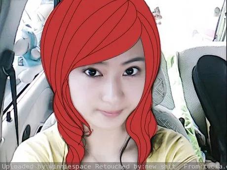 保持真实,睫毛加长一点,背景艺术化色彩化,头发要有光泽感,颜色换成酒红色,谢谢