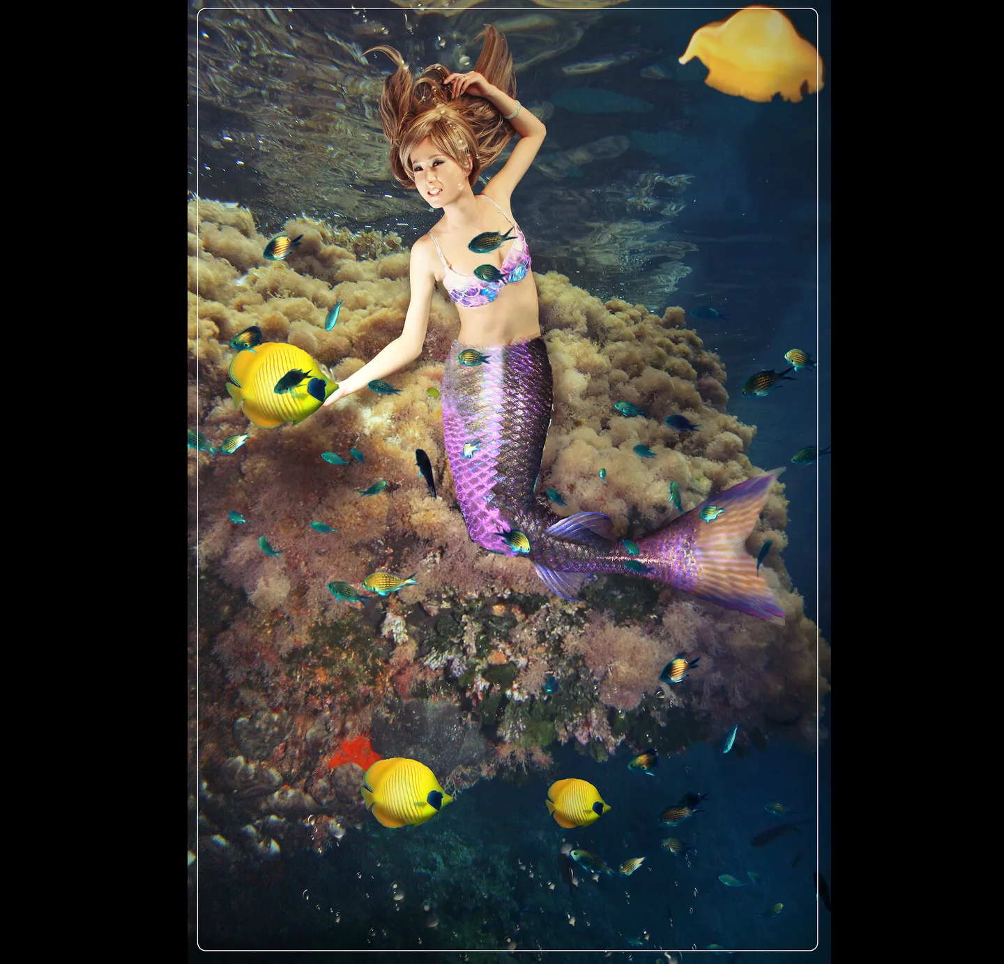 个人觉得,抠图好像有点没扣赶紧,那个鱼尾上面还有一点能看出明显的抠图的痕迹,合成木有做的很好,加油哦…… (表情)