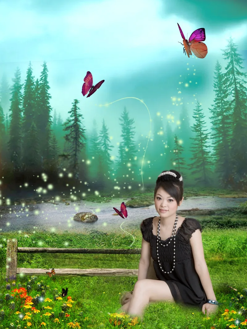 把主人放进梦幻的国度里,把手臂修瘦,肤色更亮丽,加上蝴蝶翩翩起舞,有花瓣随风飞扬,有水更好!裙子的颜色最好变成粉红色!