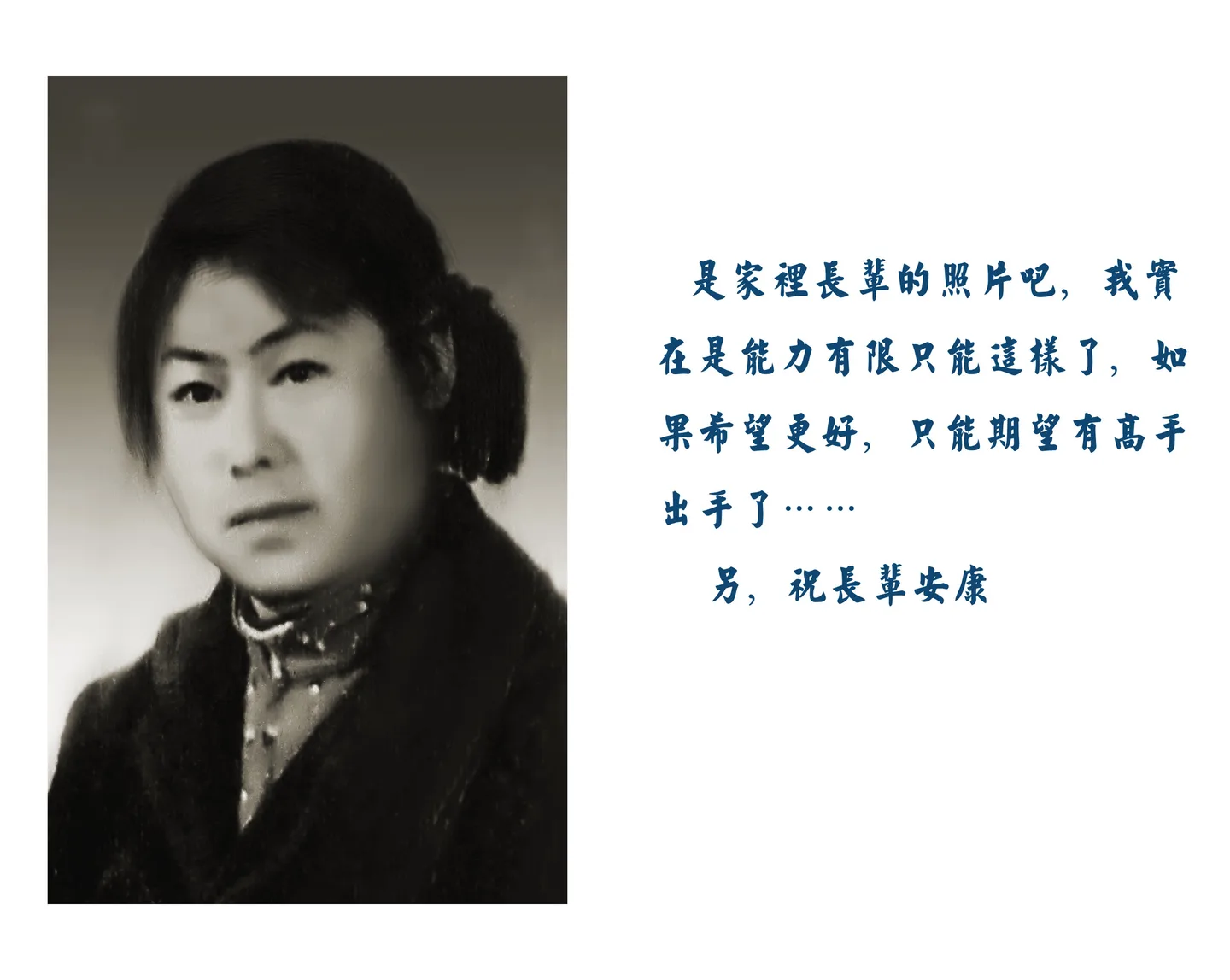 照片比较老请把折迹抹掉 面部要有现代感 如果能放大最好要六寸 把照片上的字抹掉 设计师辛苦了谢谢 美化人物脸部 基调:典雅唯美 艺术化:轻微艺术化