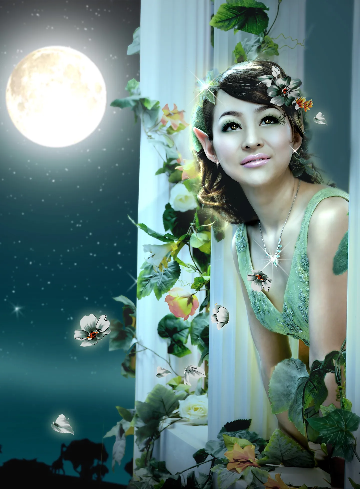 希望可以修得像精灵一样,把耳朵修成尖的,人物要深远点的,不要近景,背景最好用魔兽里森林的那种场景!!