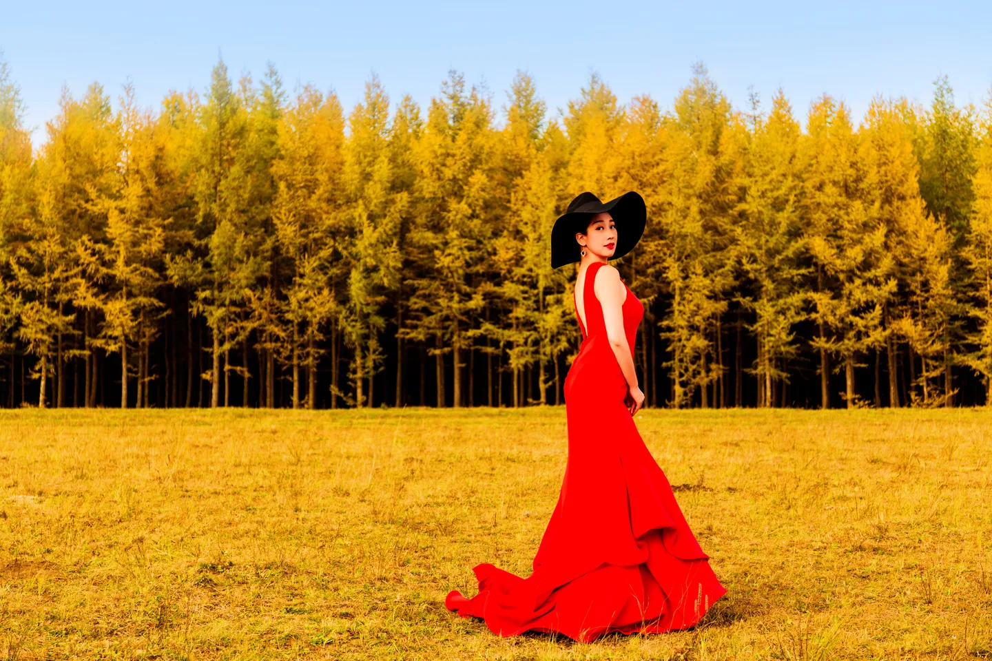 金色草地和树林跟红衣的色彩对比更鲜明了呢,身材也变好了,喜欢喜欢,谢谢雪精灵大神了哈,大图抱走