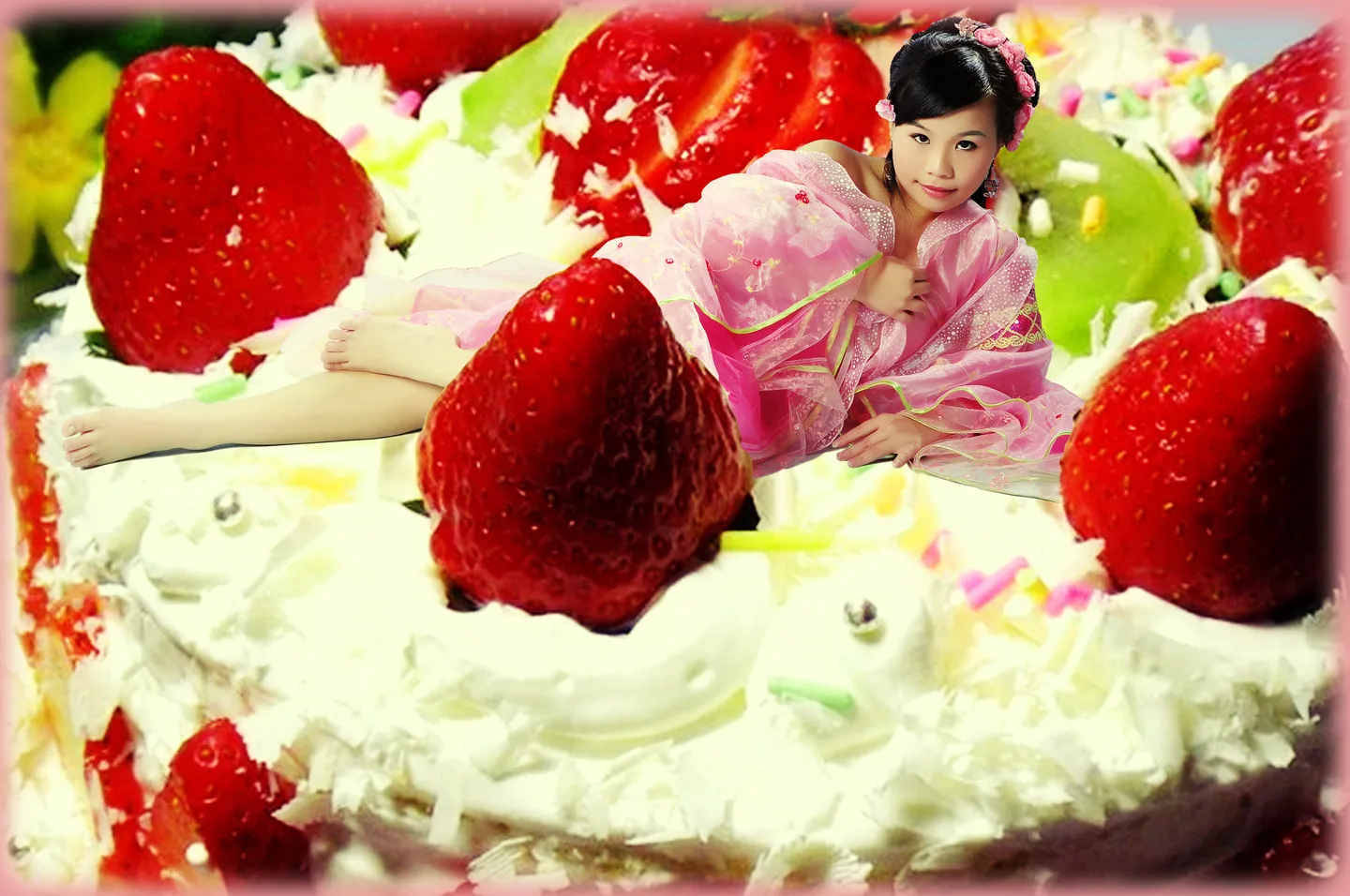 (表情)把头上的花花换成 草莓……哈哈……直接变成蛋糕的一部分,嘿嘿