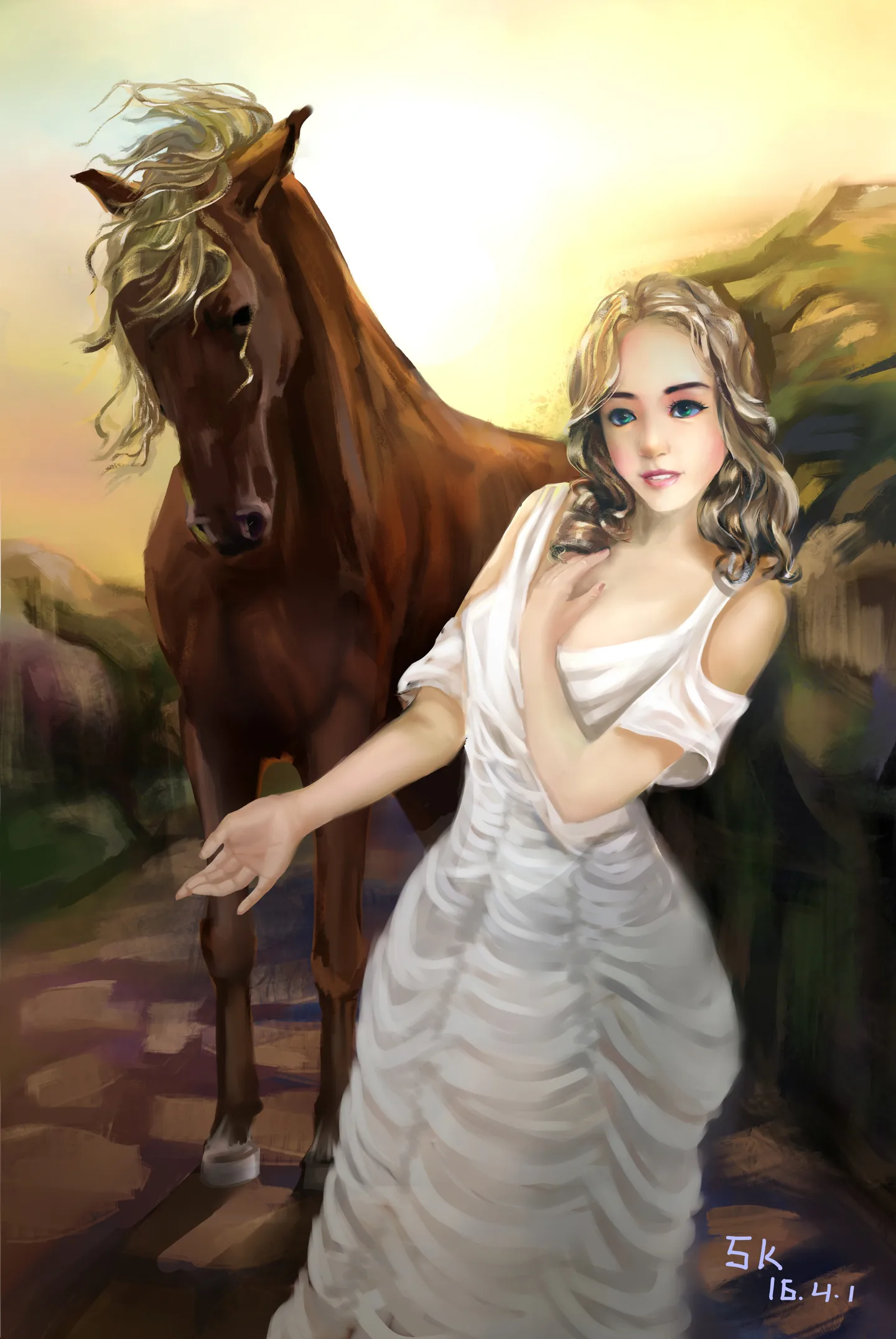哈哈哈哈,这金黄的卷毛和帅气的马毛,炒鸡有爱的!!!!!!话说,能凭空画出人物和马,已经很NB了好吗?。。。这个画风是复古的油画感觉,有一种瞬间变成欧洲人的FEEL~~~~