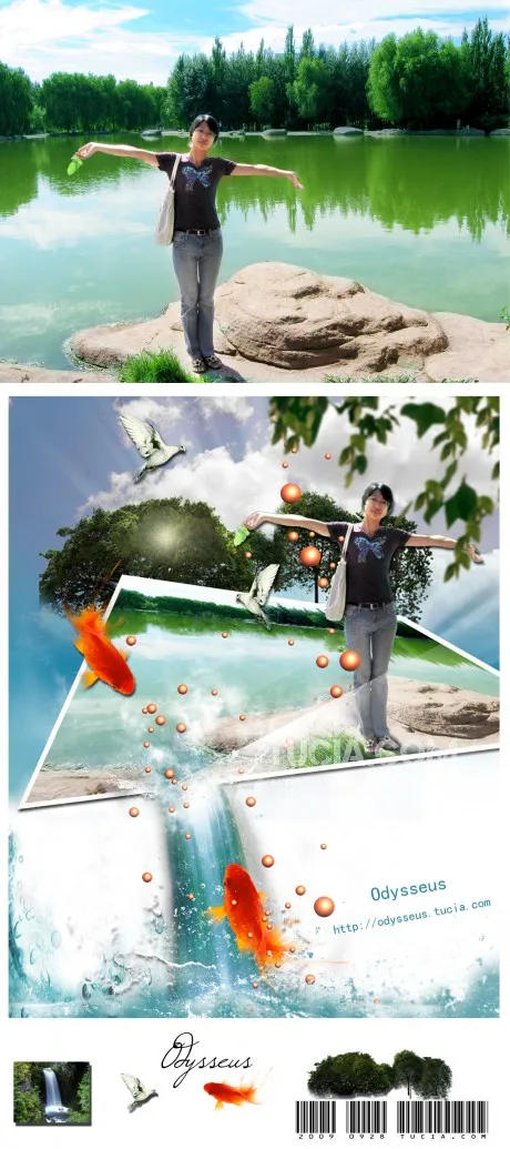 把人在原图中去掉!加上金鱼、瀑布、鸽子、树木、云层、加点光、加点水、