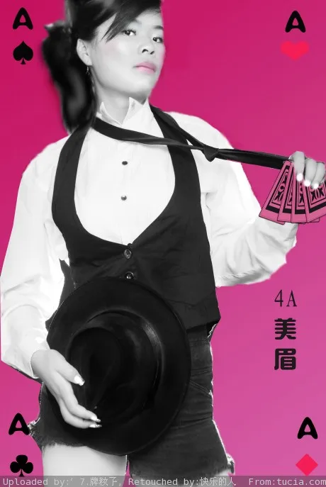 补充一下,这张图让我想到三种职业:赌王,调酒师,魔术师。但这个表情只让我觉得和赌有关。。再然后,,没有在网页中搜扑克牌,直接在家里看了看扑克牌长什么样子,再然后,简单画了四张牌,再然后给你小画了个淡妆。再然后脸形,嘴也稍改了一下。希望你满意。