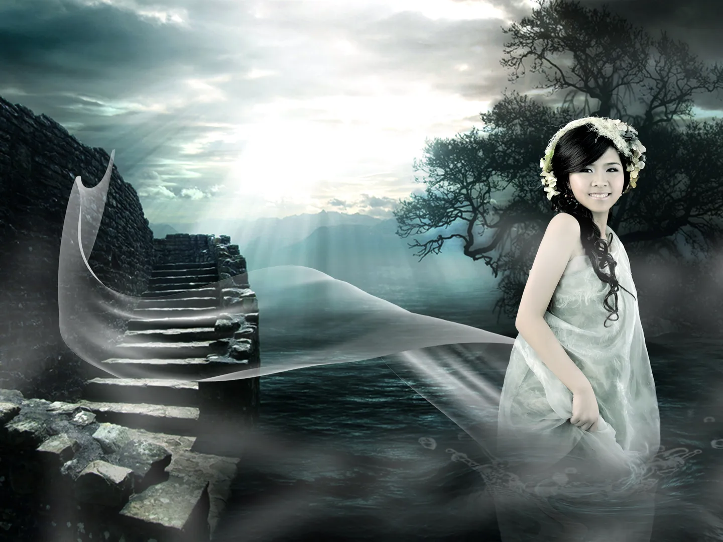 这样看像是飘浮在上面上空的幽魂,但既然是幽魂就不应该出现水花吧?这样很接界,看的人不好理解.如果是表现人物进到水里,那么上面的身躯就应该完全不透明,水面上的倒影用液化和降低不透明度的办法与实像拉开.如果是表现幽灵,我觉得水花可以不需要吧