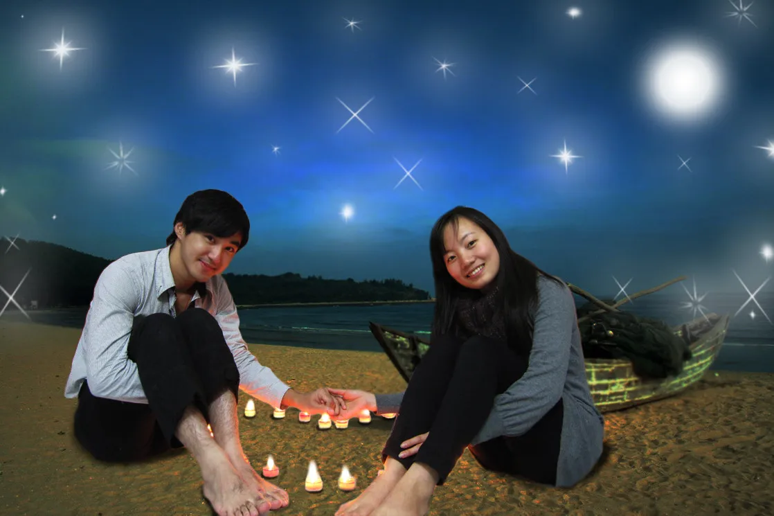 跪求设计师们帮我改下背景,换个沙滩的背景,然后环境调浪漫就ok了,谢谢各位
