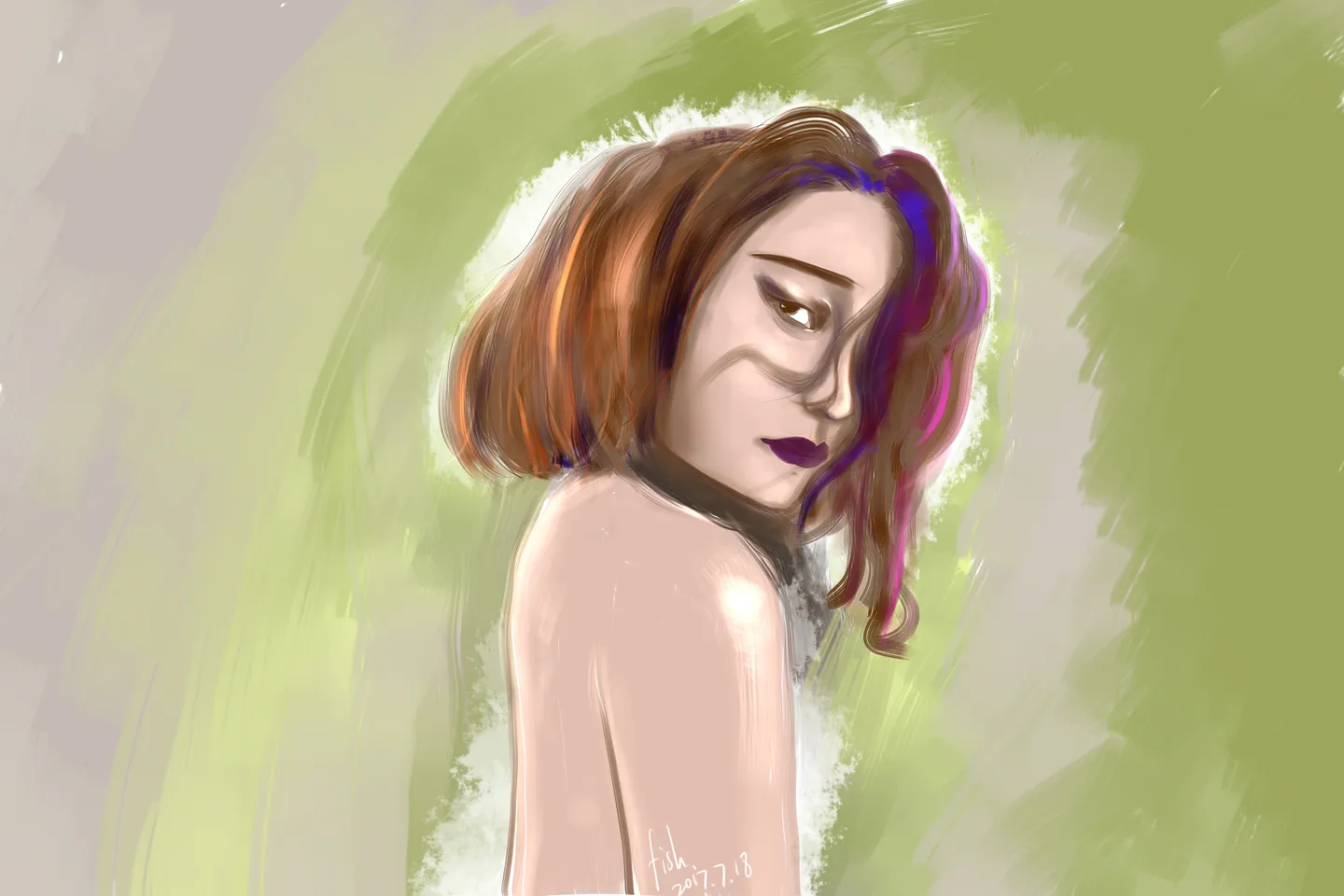 嘴唇、紫色发丝、背部