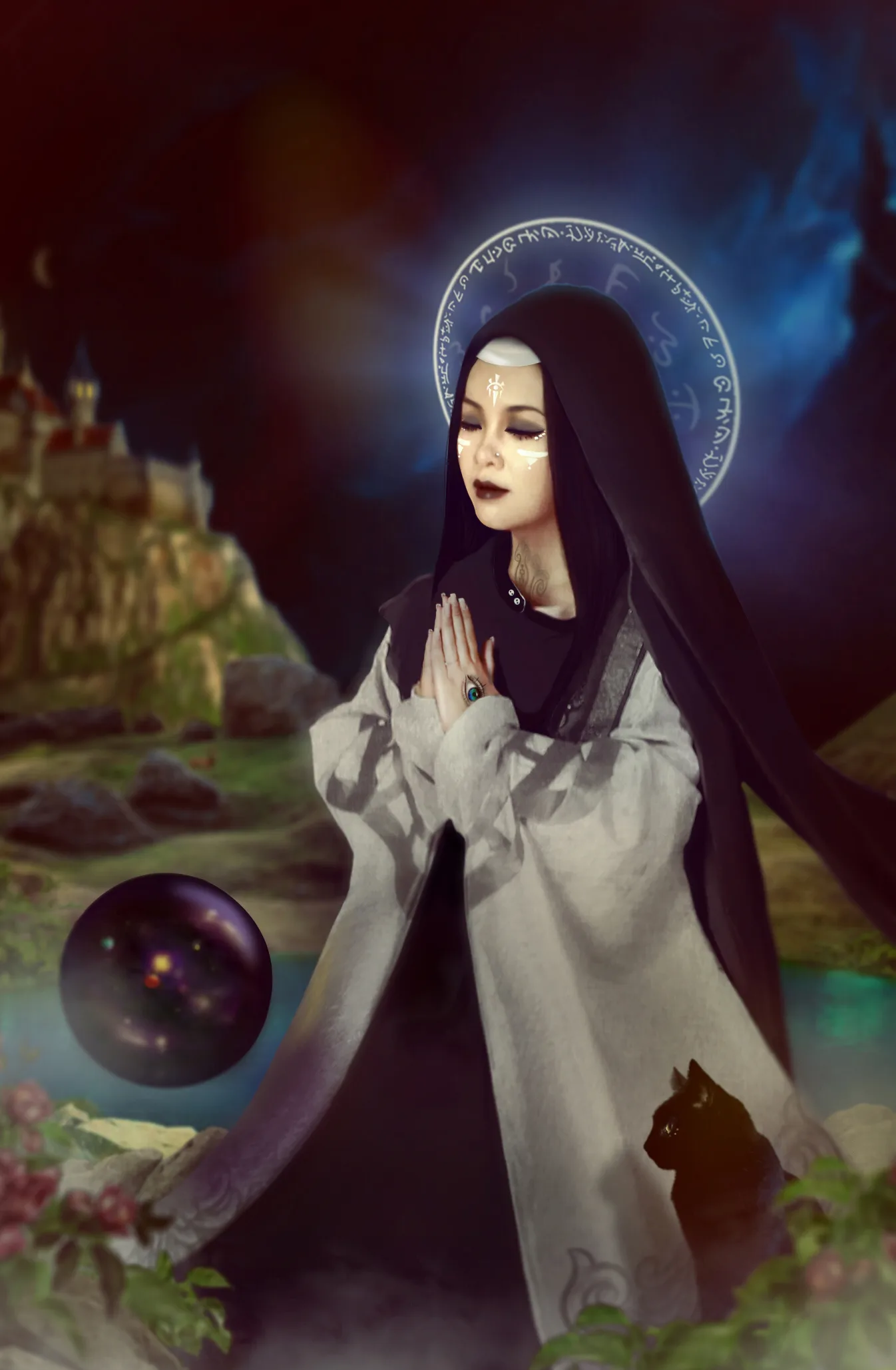 大神修图辛苦了!这幅作品的每一个细节都相当精致啊,不愧是用生命在创作的尽善尽美大作!!无论是中世纪服饰、头顶上的光效、脸上印记脖子纹身、手背的预言家之眼,还有身边的黑猫和紫色水晶球……都让人惊叹不已。这构思奇妙之极,抱着这图,我能美美地乐上一个月啊有木有!