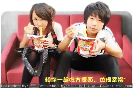 换个人物坐在沙发上的卡通背景,把人物卡通化,把脸上的心去掉,稍微突出下方便面,在下面加上字“和你一起吃方便面,也很幸福!”把女生的头发弄成长发,披下来,谢谢,辛苦叻!