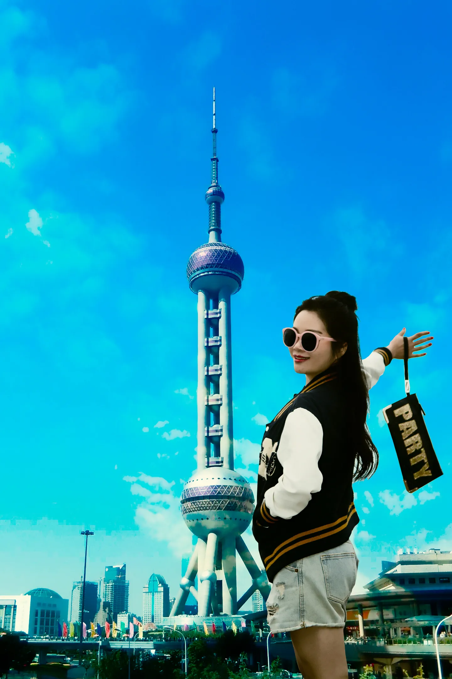 谢谢大人修图,这背景换的好看啊,人物色调更清晰,蓝天下的东方明珠也是美得不行啊