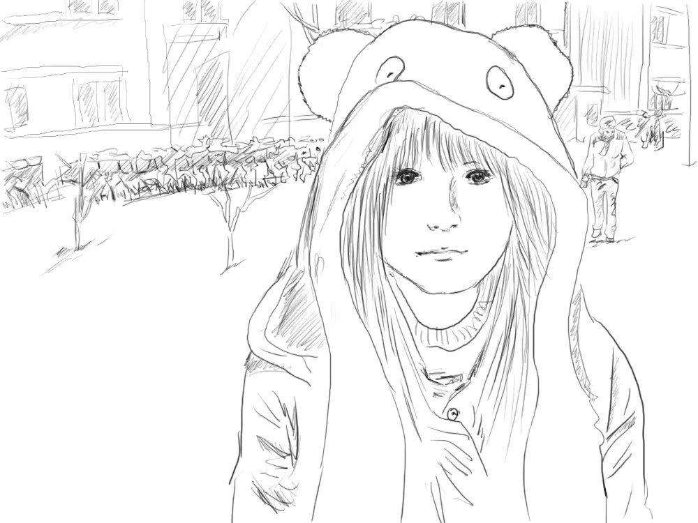 这张拍的时候打了闪光~人物面部五官好像模糊了~希望设计师能改成鼠绘卡通风格的~希望是那种烂漫的温馨的可爱的那种感觉的~非常感谢