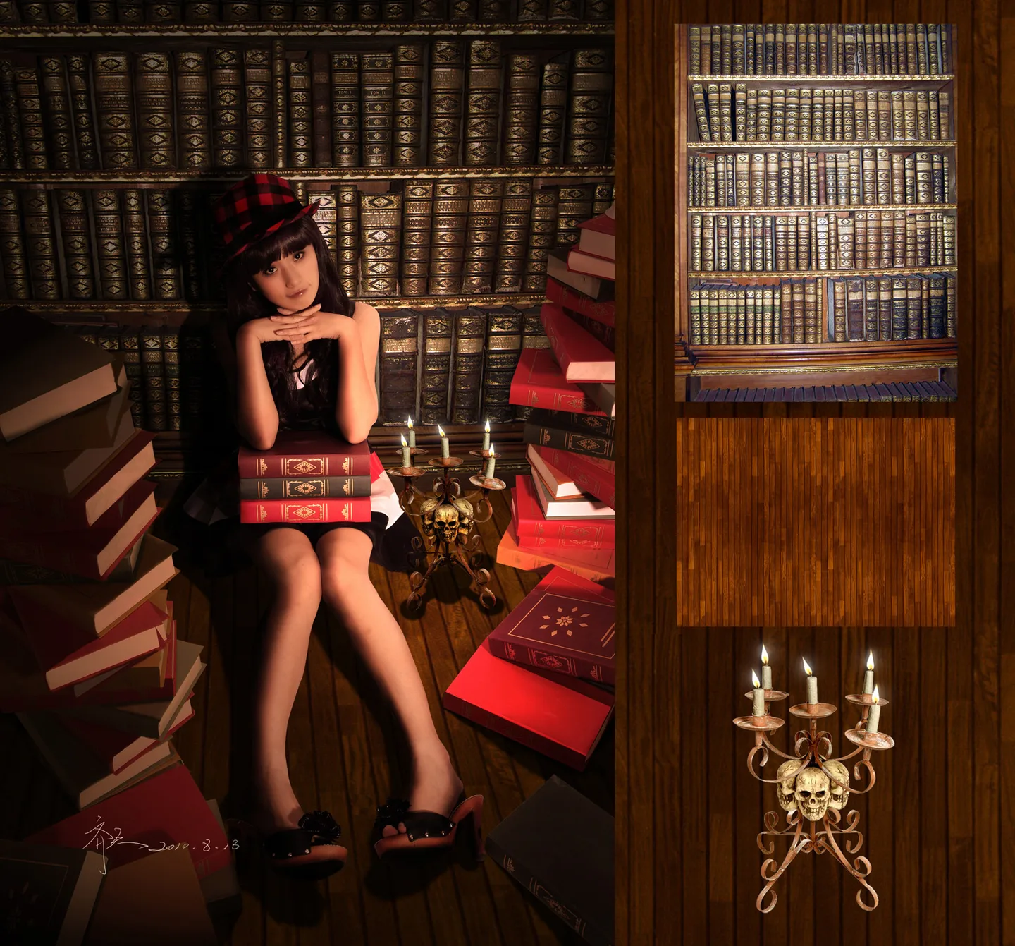 这图合得真不错~人物的阴影考虑得很细致,但是蜡烛右边的书本的阴影是不是也应该考虑下蜡烛光源的问题呢~~其他地方处理得真的很完美呢~