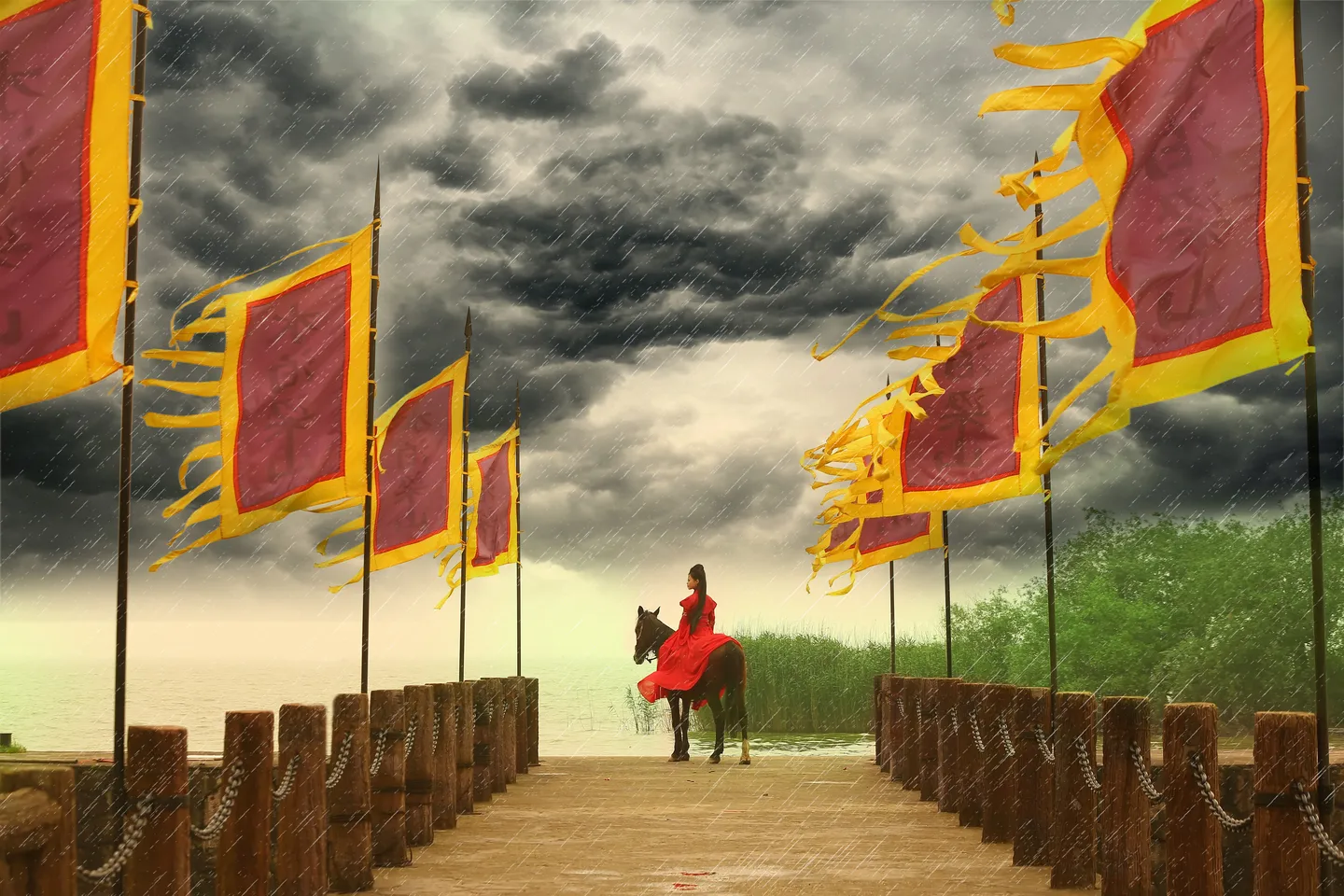 记得它们两个城码头是长得不一样哈。。这个水浒城的旗子写着水泊梁山~~