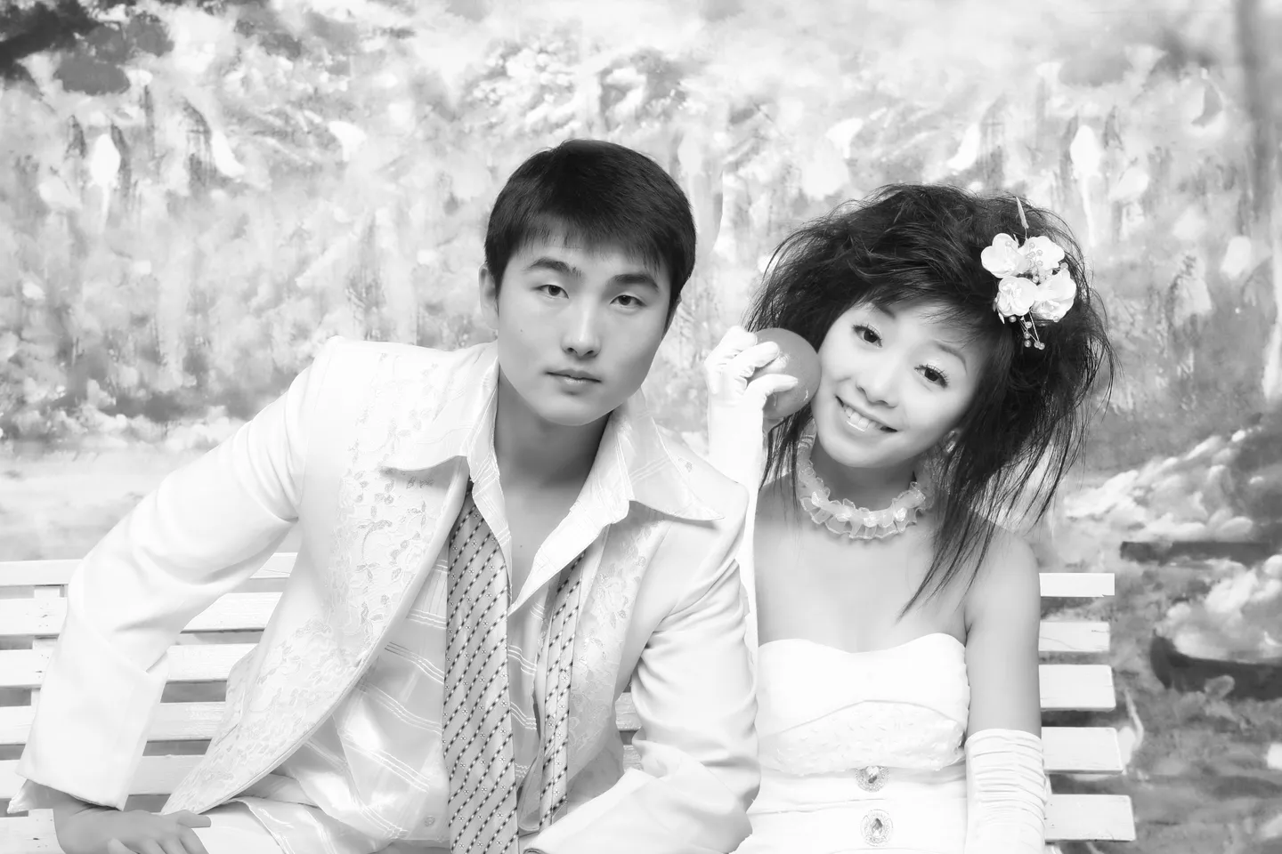 求合成!这是我男友的照片,我上传了一张我自己的穿婚纱拿苹果的那张,帮我把这两张合成吧。谢谢大师