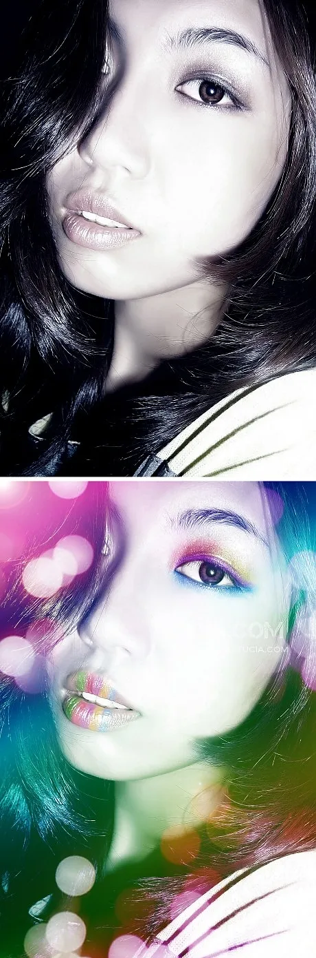 呵呵,其实就是你说的色彩叠加,我用的图层模式是柔光,另外旁边的光影也是高光素材,你应该知道吧.细腻的感觉全靠你的图质量好,并且你原本画的眼影就是珠光的,嘴唇也不干燥,所以才会出得了这效果,并不是每张图都能很好出这种效果的,质量不好的图倒是可以在色彩的地方加点杂色模仿质感,但效果并不怎么样...