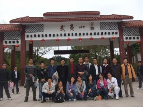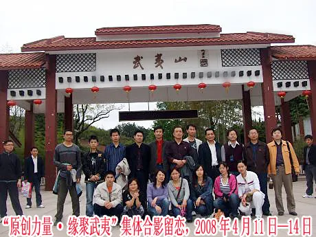 突出集体主人物,色彩清新明快,“武夷山”题字背影保留。图片作纪念之用。最下面加上一行文字“原创力量·缘聚武夷”集体合影留恋,2008年4月11日—14日。图片上的主人公是网络文友。