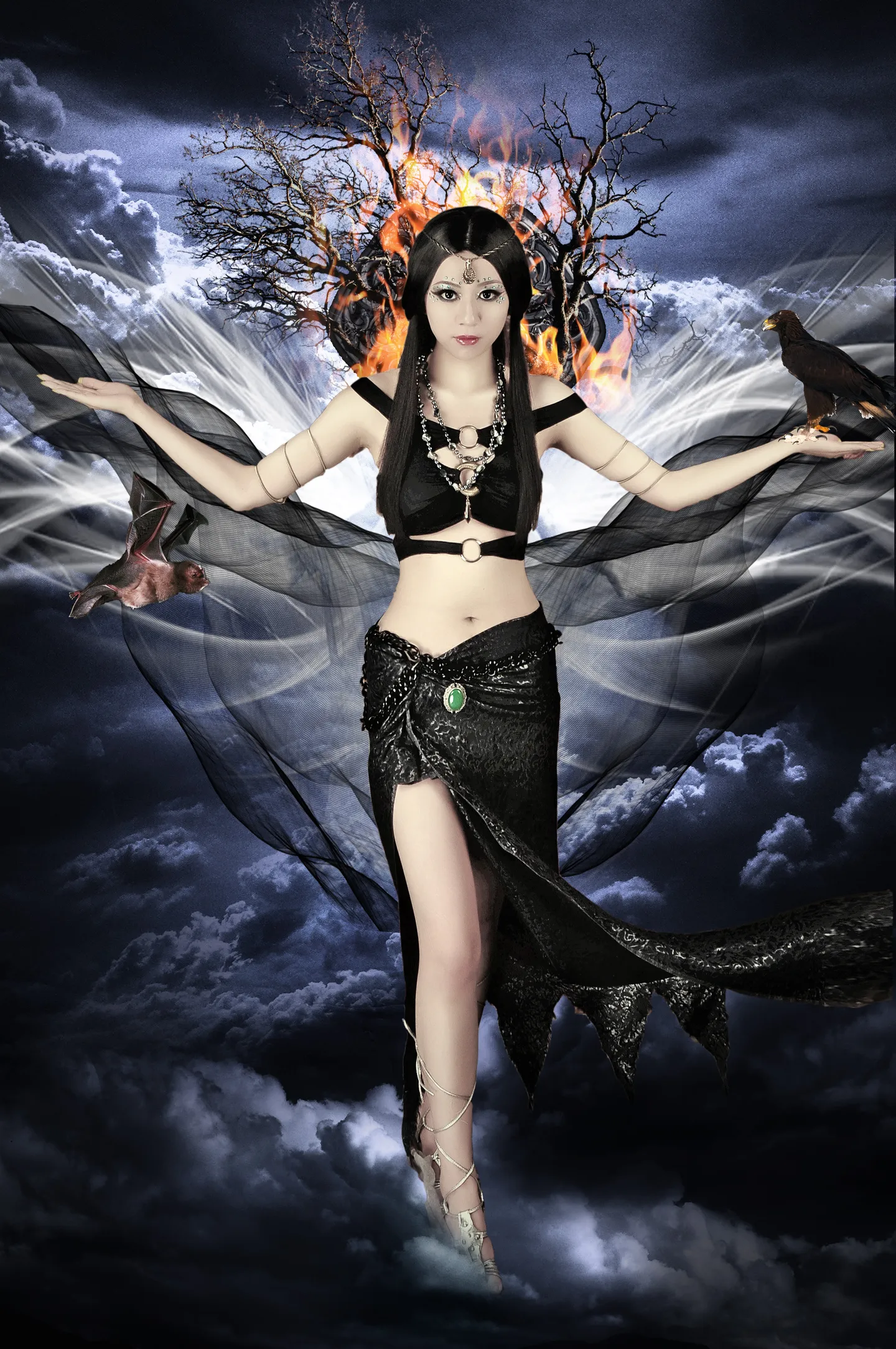 好了,修改过了!蝙蝠从手上移下来,紫色纱巾改成黑色,脚下也过度好了。亲们看看还有什么要改的??按F5刷新啊!