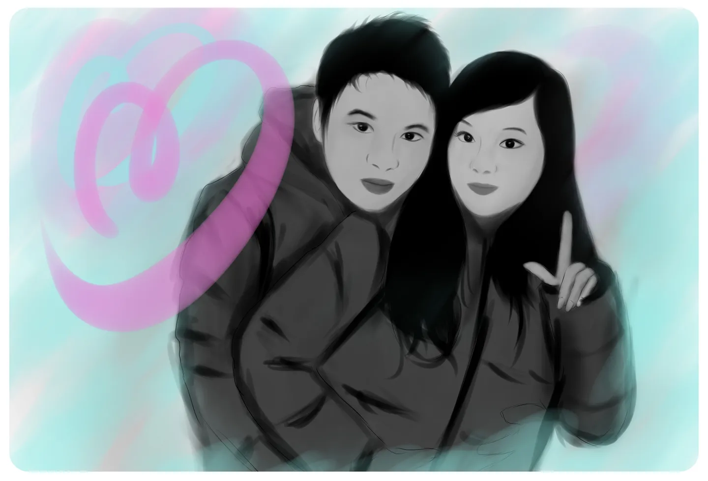 是这样的,我去年答应信宝帮画一张她跟清风的合影,俺一直没完成,所以今天就帮画信宝跟她男朋友的算是补上之前欠下的图(清宝跟清风是几年的朋友跟同事)
