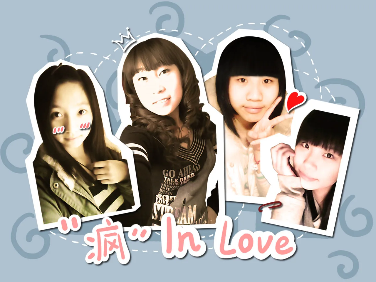 另外三张你都有了~背景换掉~换成四个框框的~做成我给你看海报的那个样子~打一行粉色的“疯”IN LOVE~谢谢小白~~崇拜你哦~~ 背景:朦胧化 艺术化:轻微艺术化