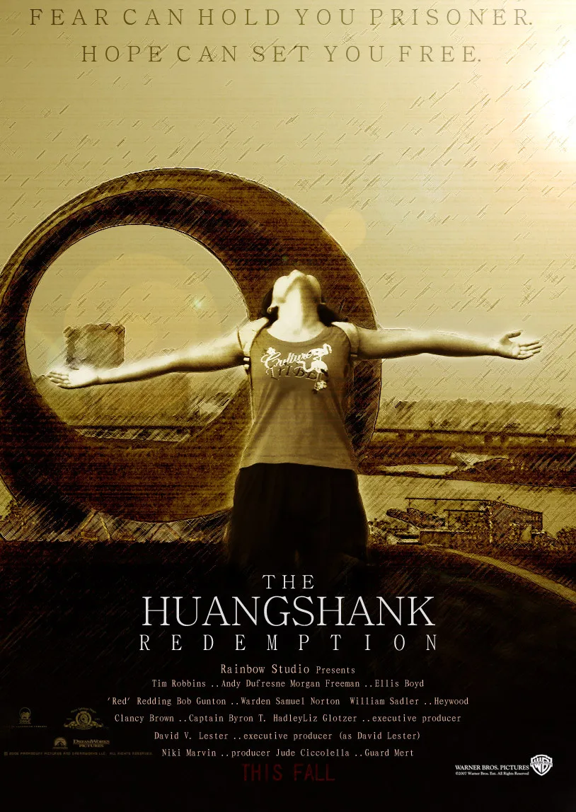 请做一下<肖申克的救赎>海报的感觉.不用把角度换掉.就换一点色调.加上那个海报文字.把原版海报的shawshank改成 huangshank. 电影公司的信息写 RAINBOW STUDIO