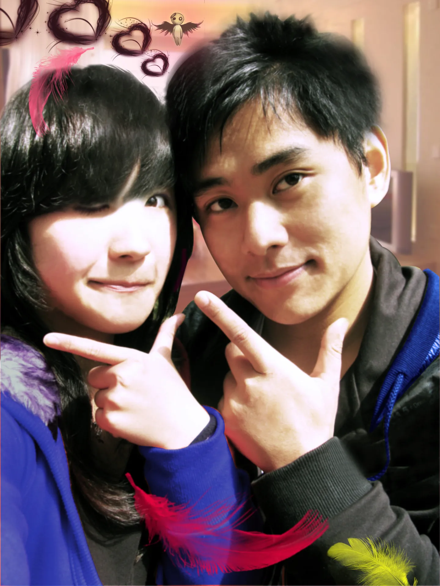 和男友的照片,觉得很普通希望能够处理得有意境一点。保持真实性。(ps:把女生的脸p显得瘦一点O(∩_∩)O~)谢谢啦~~