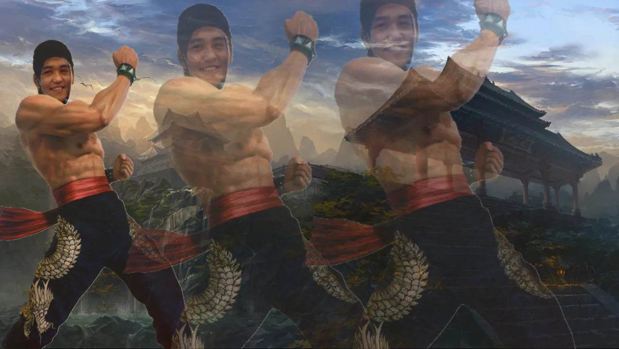 人脸的融和自然,整体人物有游戏效果,拳风之类的。 换一个好看的背景。 艺术化:深度艺术化。