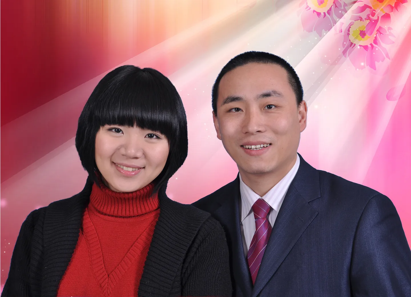 把雀斑去掉、把肤色调亮,因为是结婚照,请换上一个唯美的背景,把男士的眉毛和眼角美化一下,女士的发型美化一下。 用途:家庭纪念 基调:典雅唯美 艺术化:轻微艺术化 美化人物脸部 美化身材/体型