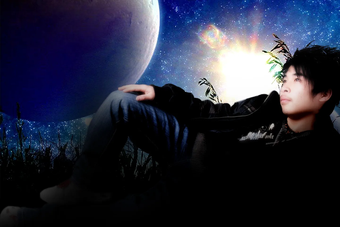 用途:网络征友 请把脸上调一下. 弄个背景: 作成我躺着观望天空或夜景什么的, 要把脑后的那块反光扳处理一下哦! 谢谢!